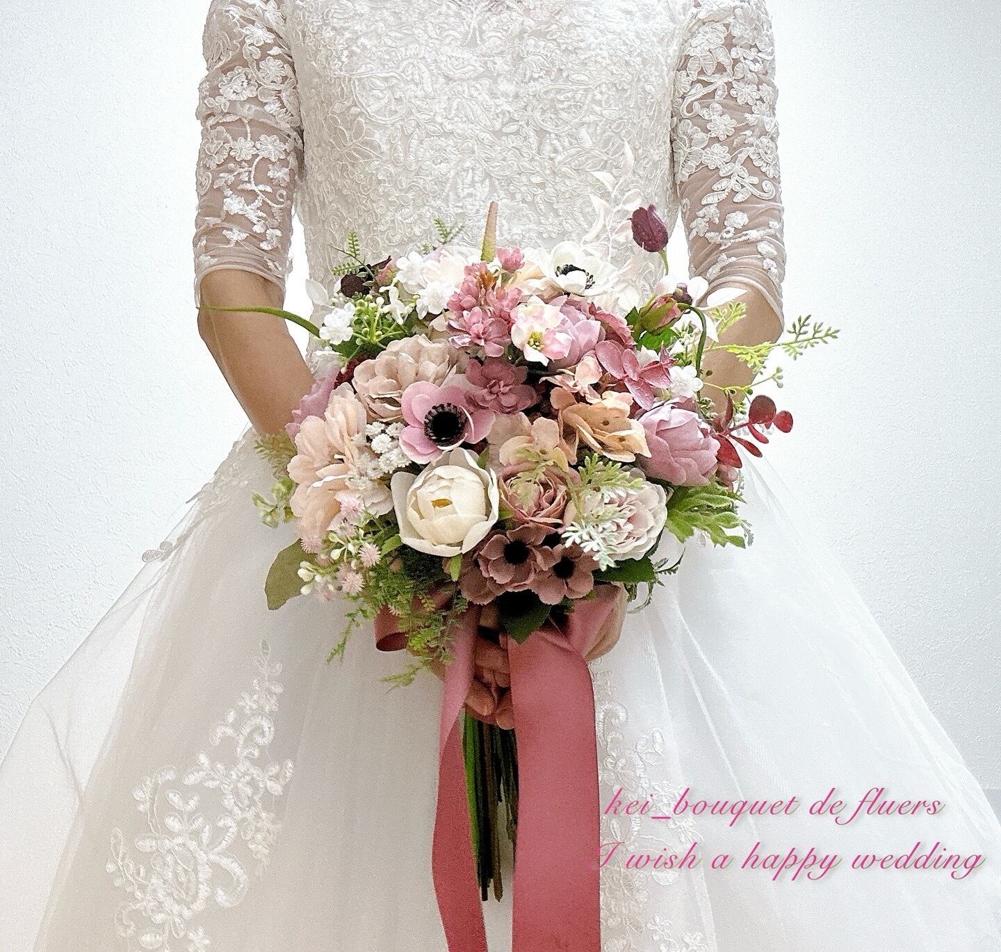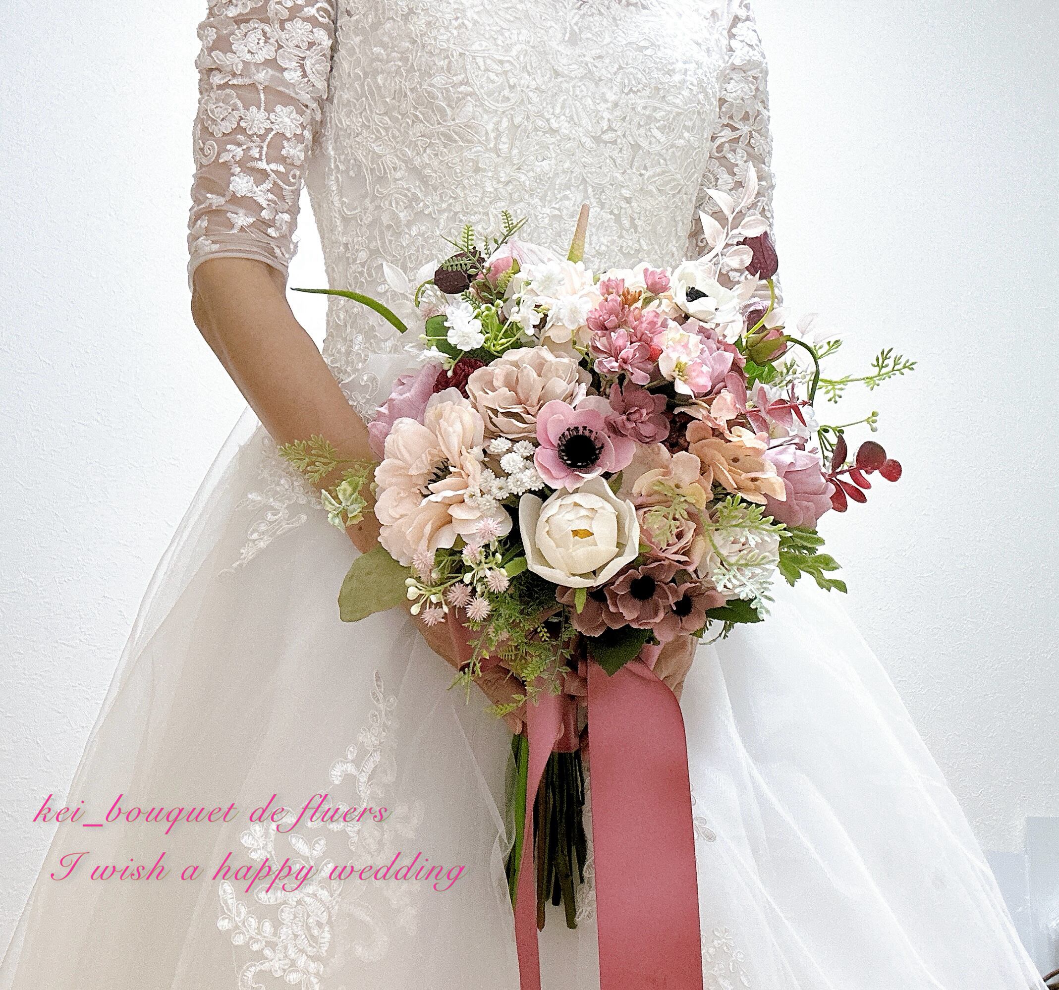 ブーケの手元にはサテンリボンをあしらいました。優雅さと清楚さを兼ね備えたデザインが特徴です。